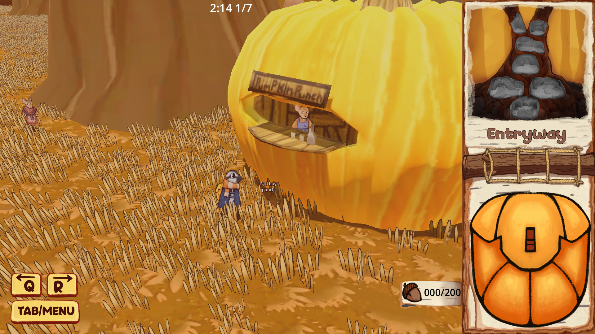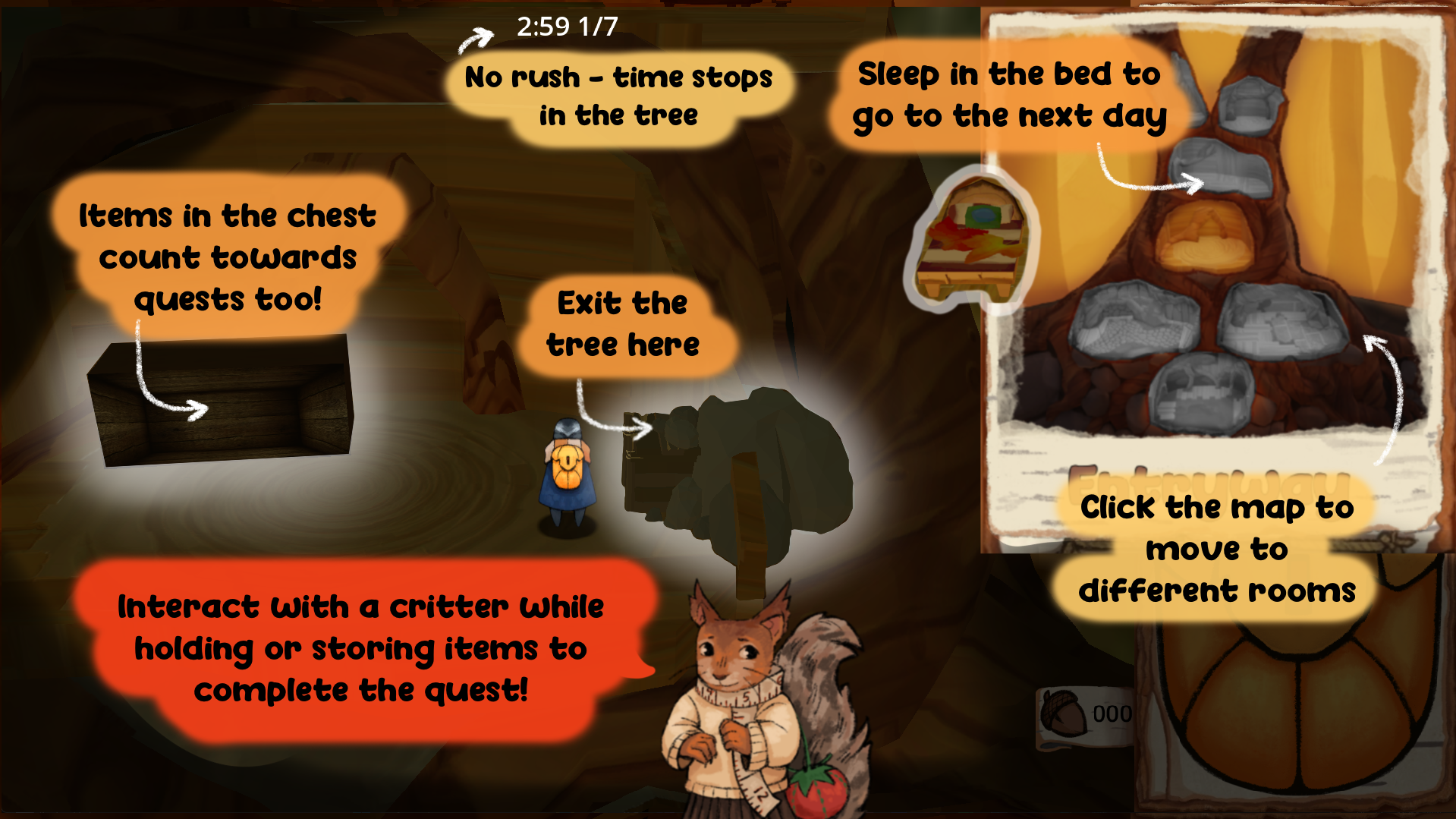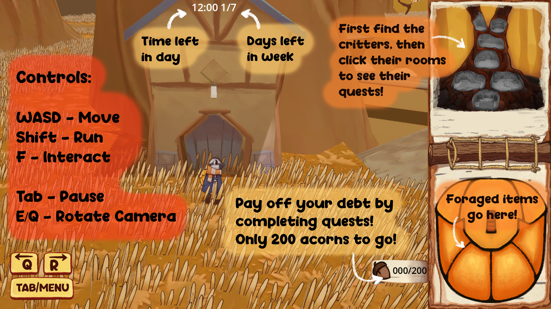 Help gather materials in a Borrowers-eque 2.5D world to trade with the Forest Folk in exchange of Acorns (currency) to pay off Quincy's debt before winter arrives in 7 days.